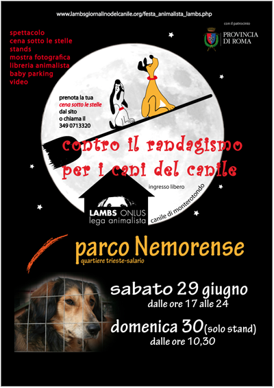 a Roma, al parco Nemorense ,la LAMBS organizza la, ormai tradizionale, festa contro il randagismo e in aiuto dei cani del canile.L'evento servirà a reperire fondi per le innumerevoli esigenze dei 150 cani ospiti della struttura gestita dall'associazione..